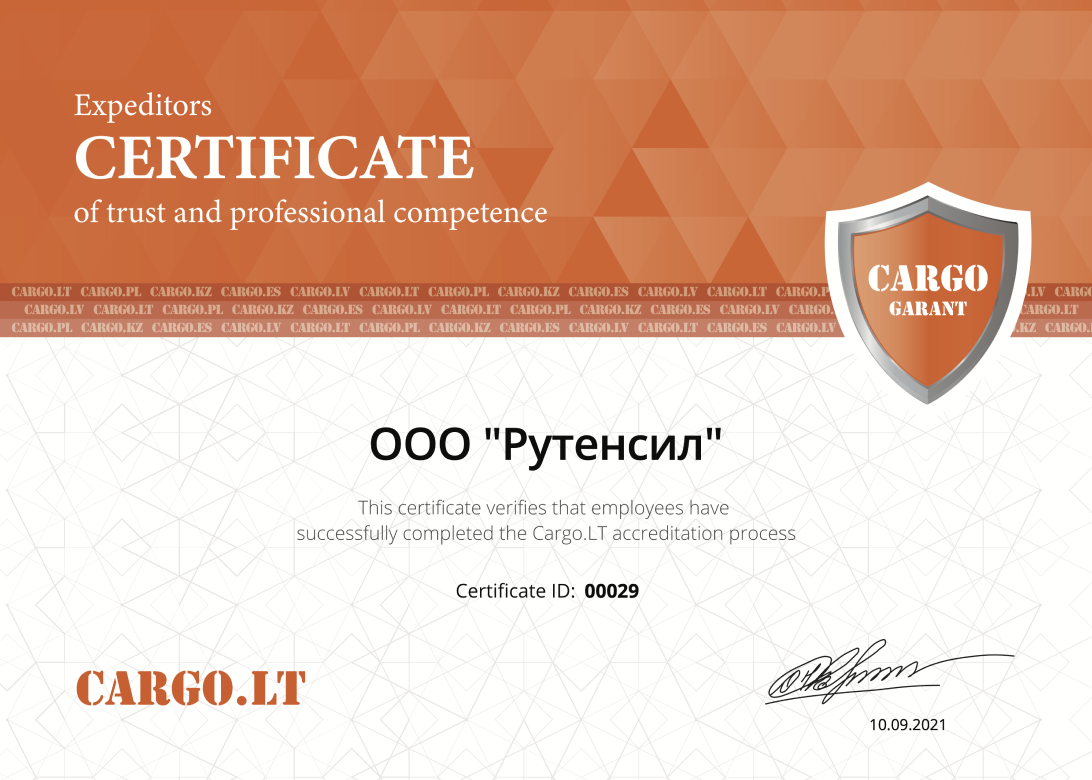 Сертификат CargoGarant выдается компаниям, которые соответствуют критериям надежности. Мы, Rutensil, - первые в России, кто получил его
